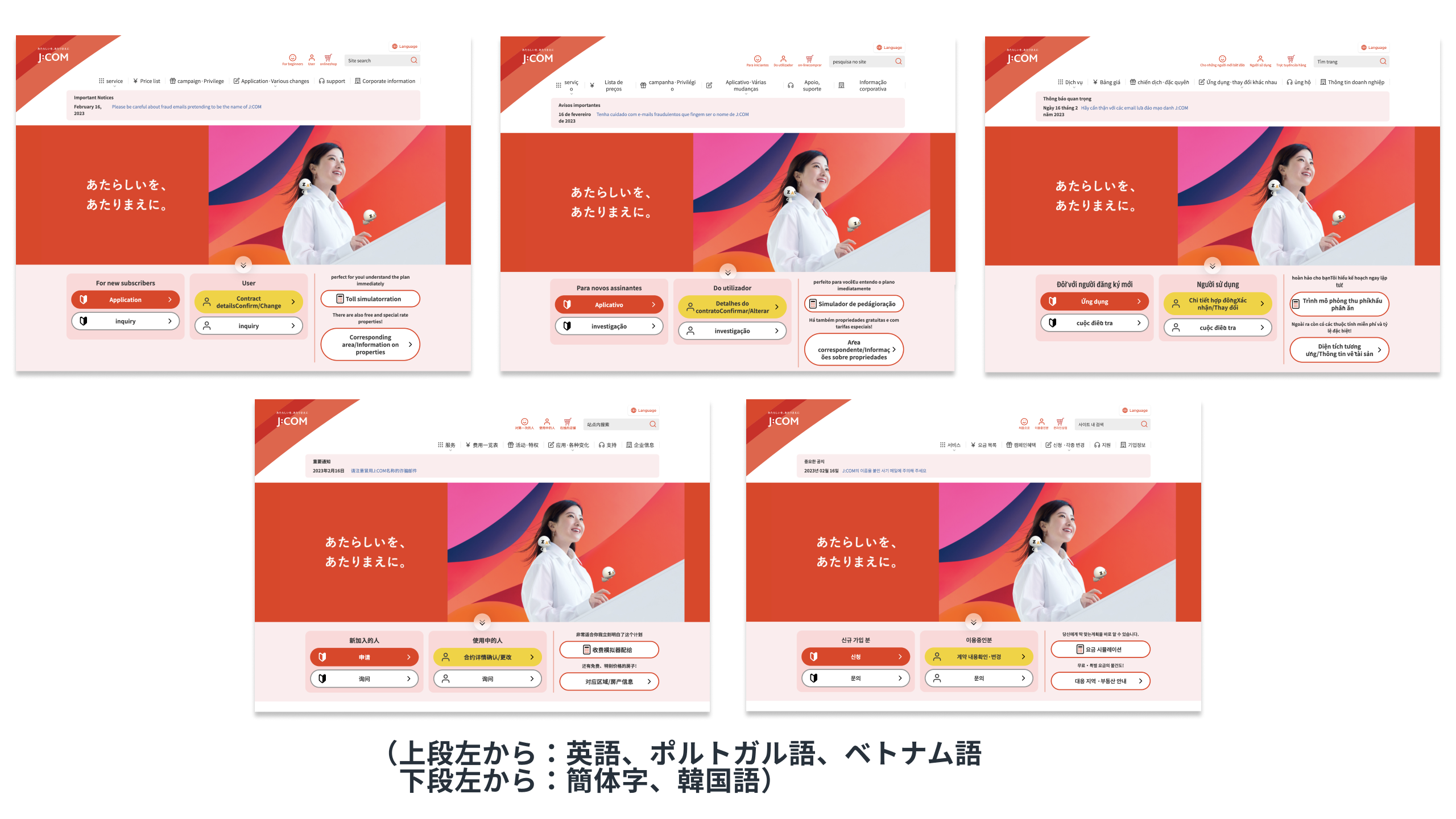J:COM の公式サイトを、英語・ポルトガル語・ベトナム語・簡体字・韓国語の5言語で表示しています。対象言語は、日本全体における在留外国人の使用言語割合やユーザーとなりうる地域にお住まいの在留外国人の使用言語を元に選定しました。