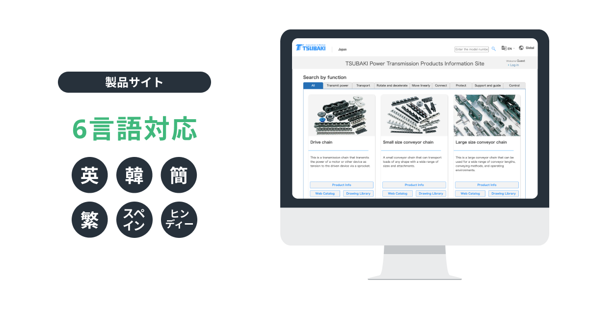 椿本チエインの産業用機械製品情報サイトに導入され、日本語から6言語(英語、韓国語、簡体字、繁体字、スペイン語、ヒンディー語)に対応しています。