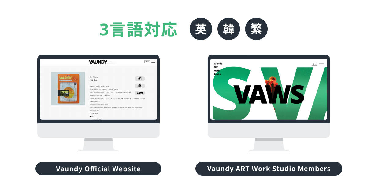 日本人ファンだけでなく、世界中のファンに向けても最新情報や限定コンテンツを届けるため、「Vaundy Official Website」および「Vaundy ART Work Studio Members」に WOVN.io を導入し、日本語から3言語へ多言語対応されました。